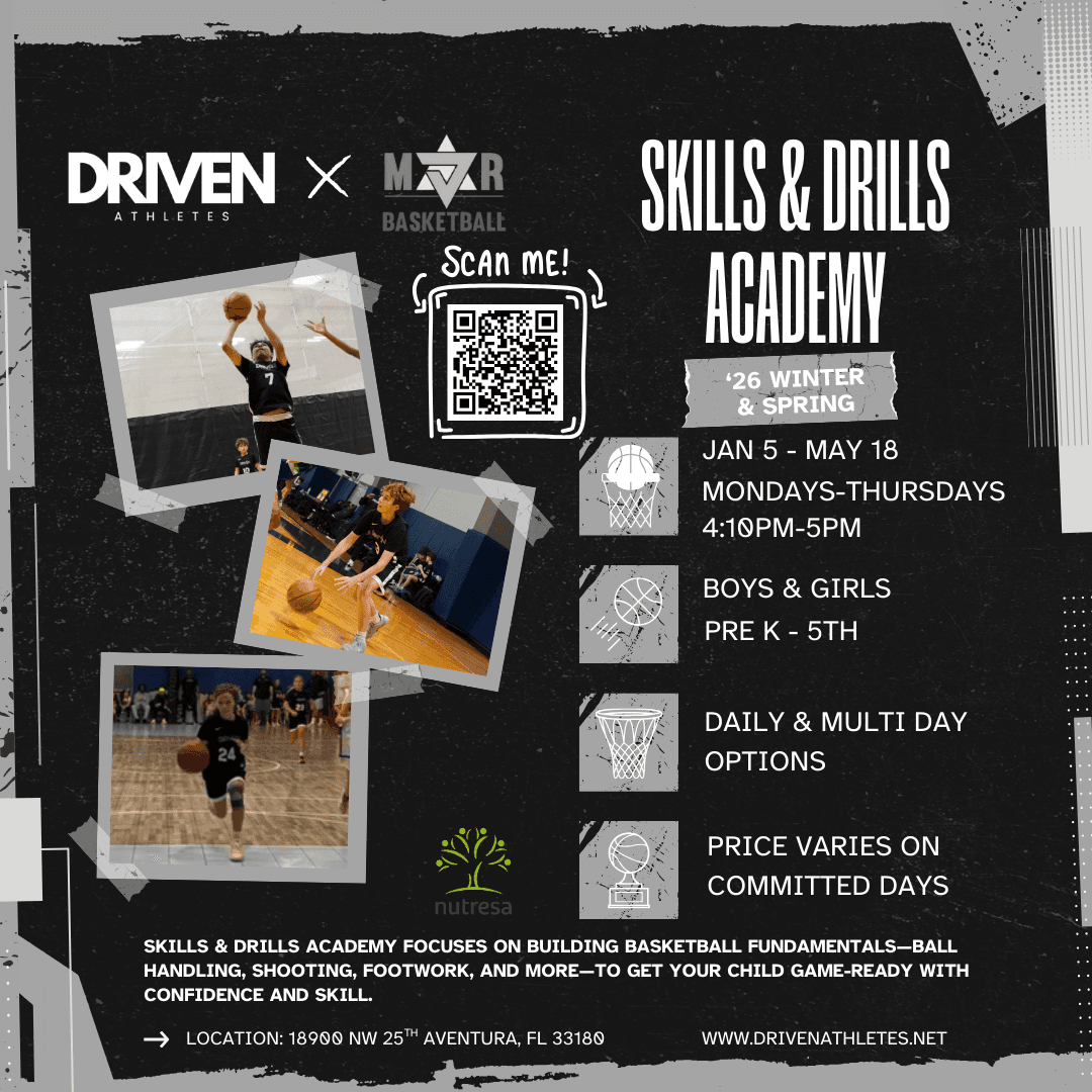 The Driven x MARJCC Skills & Drills Academy is designed to help young athletes build a strong basketball foundation in a fun, structured, and high-energy environment. Running throughout the Winter & Spring season (January 5 – May 18), sessions take place Monday through Thursday from 4:10–5:00 PM and are open to boys and girls in Pre-K through 5th grade. Our experienced coaching staff focuses on essential fundamentals such as ball handling, shooting, footwork, coordination, and game awareness, while building confidence and a love for the game. Families can choose daily or multi-day options, with pricing based on committed days, making it flexible for every schedule. This program is perfect for athletes looking to develop skills, improve consistency, and become more game-ready in a positive, supportive setting.